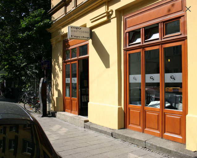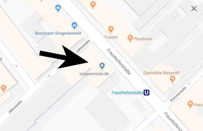 The print shop is located on Fraunhoferstraße 14, Glockenbach quarter, Isarvorstadt in Munich, only 200 meters from the historic centre ring. The underground and tram station "Fraunhoferstraße" is right outside the door.